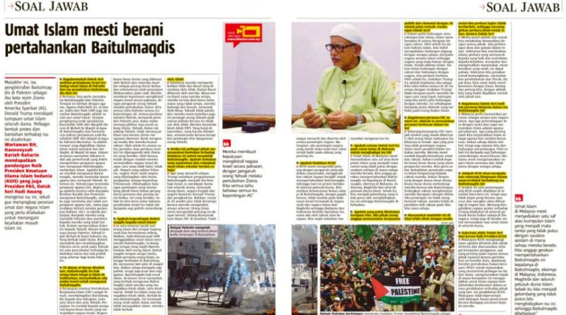 Mutakhir ini, isu pengiktirafan Baitulmaqdis di Palestin sebagai ibu kota Israel oleh Presiden Amerika Syarikat (AS), Donald Trump mendapat tumpuan umat Islam seluruh dunia. Pelbagai bentuk protes dan bantahan terhadap isu ini dizahirkan. Wartawan BH, Hanneeyzah Bariah Baharin mendapatkan pandangan Naib Presiden Kesatuan Ulama Islam Sedunia (KUIS) yang juga Presiden PAS, Dato’ Seri Abdul Hadi Awang mengenai isu ini, sekali gus menyingkap peranan umat dan negara Islam yang perlu dilakukan untuk menangani kejahatan musuh Islam ini.