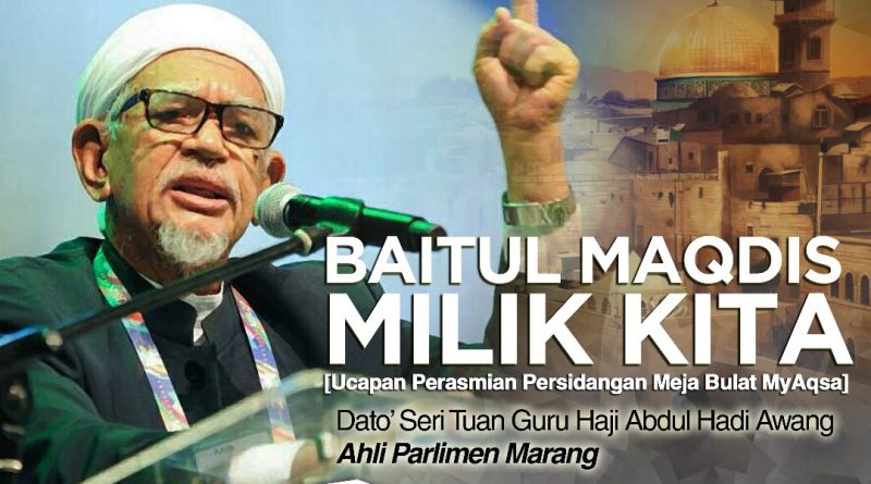 (Teks ini adalah terjemahan ucapan perasmian Dato’ Seri Tuan Guru Haji Abdul Hadi Awang sempena Majlis Perasmian Persidangan Meja Bulat MyAqsa Ulama Sedunia Mengenai Baitul Maqdis pada 27-28 Januari 2018 di Pullman Putrajaya Lakeside. Disediakan oleh Pejabat Presiden PAS) – HARAKAHDAILY 30/1/2018