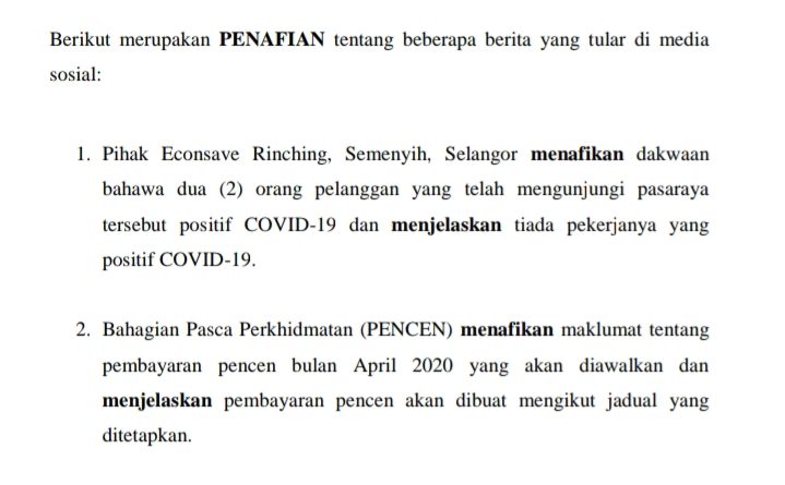 1. Pihak Econsave Rinching, Semenyih, Selangor menafikan dakwaan bahawa dua (2) orang pelanggan yang telah mengunjungi pasaraya tersebut positif COVID-19 dan menjelaskan tiada pekerjanya yang positif COVID-19.