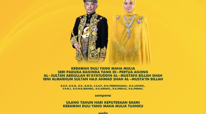 MERAFAK sembah takzim Kebawah Duli Yang Maha Mulia Seri Paduka Baginda Yang di-Pertuan Agong XVI, Al-Sultan Abdullah Ri’ayatuddin Al-Mustafa Billah Shah ibni Al-Marhum Sultan Haji Ahmad Shah Al-Musta’in Billah, sempena Sambutan Ulang Tahun Hari Keputeraan Rasmi Kebawah Duli Yang Maha Mulia Tuanku pada 8 Jun 2020 bersamaan 16 Syawal 1441H.