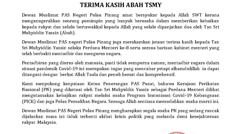 Dewan Muslimat PAS negeri Pulau Pinang juga merakamkan jutaan terima kasih kepada Tan Sri Muhyiddin Yassin selaku Perdana Menteri ke-8 serta semua barisan kabinet menteri yang telah berbakti mentadbir dan mengurus negara.