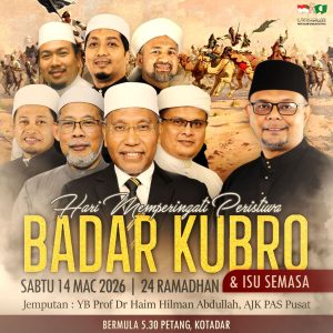 IPOH, 10 Mac – Satu program khas sempena memperingati peristiwa agung dalam sejarah Islam iaitu Badar Kubro akan diadakan di Kompleks Tarbiyah Darul Ridzuan (KOTADAR) pada Sabtu, 14 Mac 2026 bersamaan 24 Ramadan, bermula jam 5.30 petang.