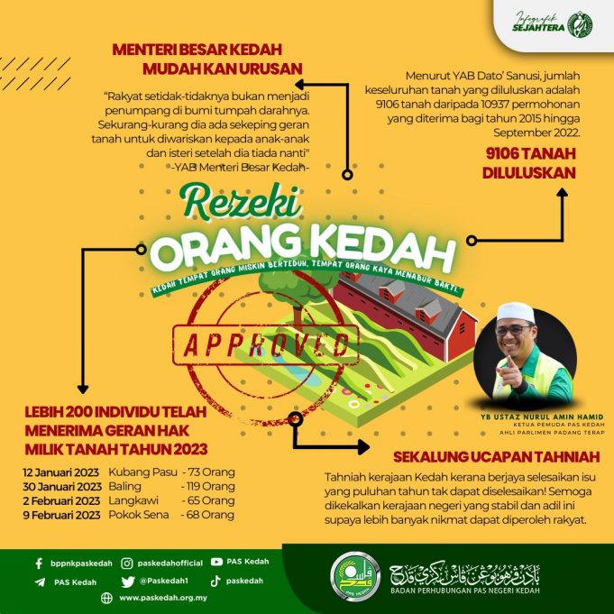 Hasrat MB Kedah untuk memastikan semua pemohon yang telah lama memohon untuk diberi geran hak milik oleh kerajaan negeri juga sedikit demi sedikit telah tercapai.