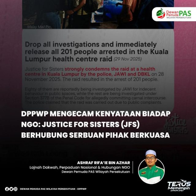 Lajnah Dakwah Dewan Pemuda PAS Wilayah Persekutuan (DPPWP) memandang serius kenyataan dikeluarkan sebuah NGO Pro LGBTQ iaitu Justice for Sisters (JFS) pada 29 November 2025 melalui kenyataan di website mereka, “Drop all investigations and immediately release all 201 people arrested in the Kuala Lumpur health centre raid.” Kenyataan tersebut secara terang-terang mempertikaikan tindakan pihak berkuasa yang menjalankan amanah undang-undang. ▪️Serbuan Pihak Berkuasa...