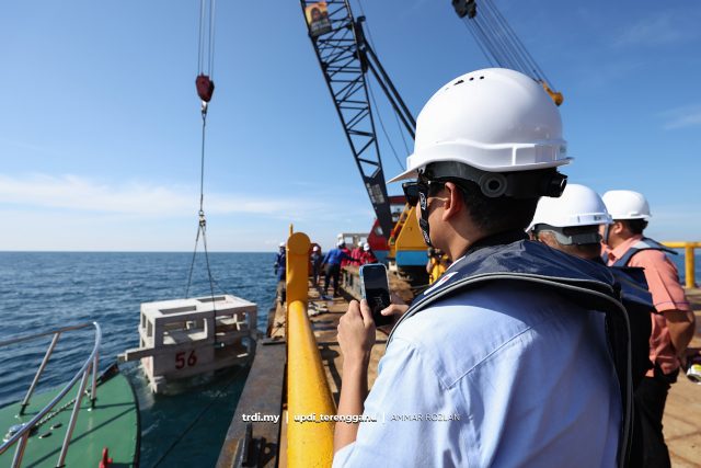 KUALA NERUS, 18 September – Perairan Tanjung Gelam pagi ini mencatat sejarah apabila Yang di-Pertuan Muda Terengganu, Tengku Muhammad Ismail Sultan Mizan Zainal Abidin berkenan mencemar duli melabuh 18 unit tukun tiruan kuboid juvenil penghalang pukat tunda (rekreasi), sebagai ikhtiar memperkasa kelestarian laut negeri. Keberangkatan tiba baginda di jeti Pejabat Perikanan Kuala Terengganu, Pulau Kambing tepat jam 9.00 pagi disambut...